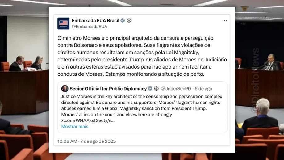 A ofensiva da embaixada dos Estados Unidos contra o ministro do STF Alexandre de Moraes ganhou tom ainda mais incisivo nesta quinta-feira, 7, justamente no