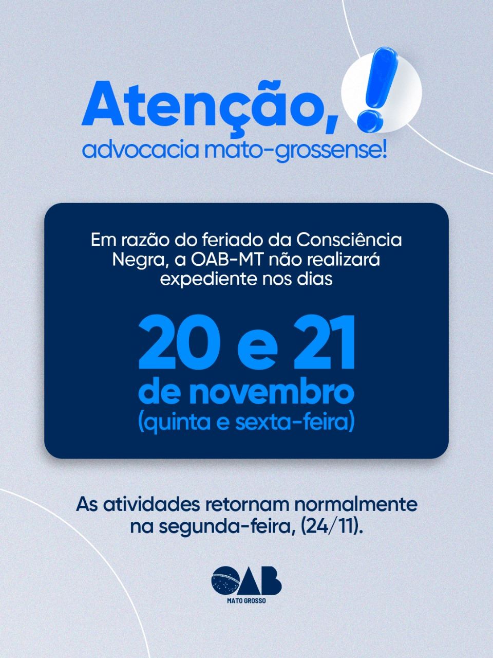 A Ordem dos Advogados do Brasil – Seccional Mato Grosso (OAB-MT) informa que não haverá expediente na sede instituição, em Cuiabá, e nas Subseções, nos