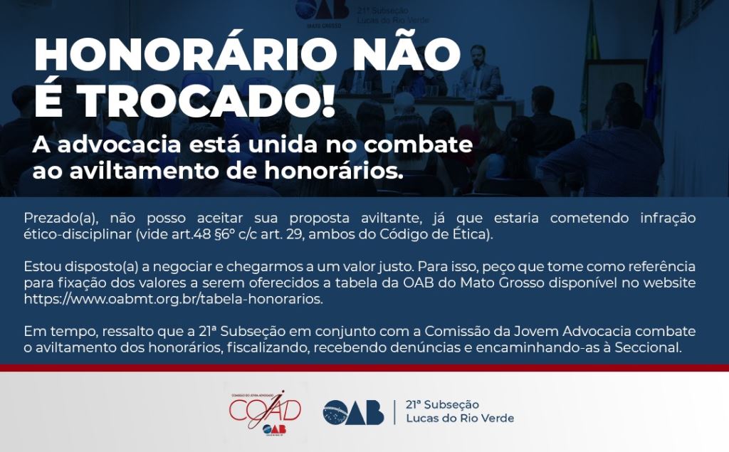 Sendo assim, a Comissão da Jovem Advocacia (COJAD) da 21ª Subseção da OAB-MT em Lucas do Rio Verde lançou a campanha “Honorário não é Trocado”.