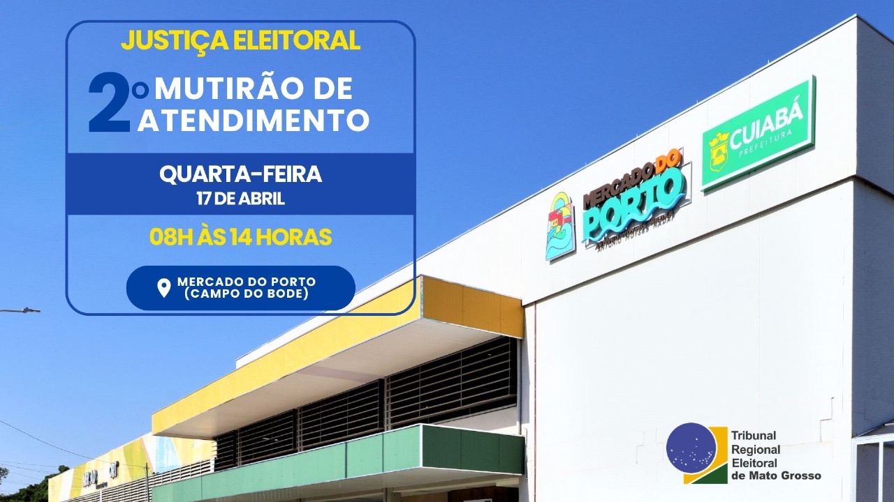 A Justiça Eleitoral confirmou um novo mutirão no Mercado do Porto, Cuiabá. O atendimento será realizado nesta quarta-feira (17.04) das 08 h às 14 horas. A 1ª Zona Eleitoral da capital ficará responsável por atender os eleitores que comparecerem ao mutirão.