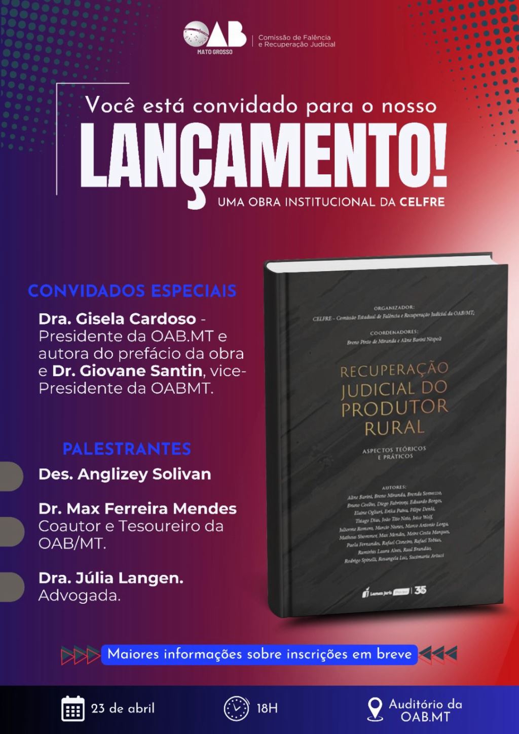 A Ordem dos Advogados do Brasil – Seccional Mato Grosso (OAB-MT), através da Comissão Estadual de Falência e Recuperação de Empresa, convida a advocacia para o lançamento do livro “Aspectos Teóricos e Práticos da Reestruturação do Produtor Rural”, uma obra institucional coletiva que trata sobre os desafios e estratégias jurídicas da insolvência do produtor rural. O evento será realizado dia 23 de abril, às 18h, no Auditório da OAB-MT, em Cuiabá.