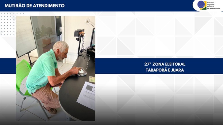 #PraTodosVerem: A imagem tem um fundo cinza e branco com formas triangulares. Na parte superior tem uma faixa azul em que se lê: “Mutirão de atendimento” no canto esquerdo e do lado direito está a logo do TRE-MT. Ao meio da imagem no canto esquerdo tem uma fotografia de um senhor sentado fazendo sua assinatura digital durante o atendimento do mutirão. Ao lado tem outra faixa azul em que se lê: “27ª Zona Eleitoral Tabaporã e Juara”.